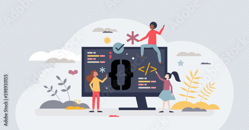 Wall mural coding for kids and writing script in digital language tiny person concept. code learning for websit - Wall murals Wall mural coding for kids and writing script in digital language tiny person concept. code learning for websit - Wall murals
