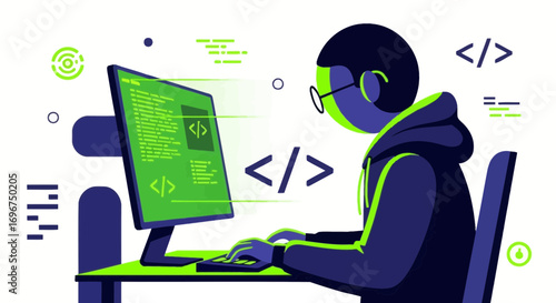 Wall mural coding illustration: developer working on a computer demonstrating programming process - Wall murals Wall mural coding illustration: developer working on a computer demonstrating programming process - Wall murals