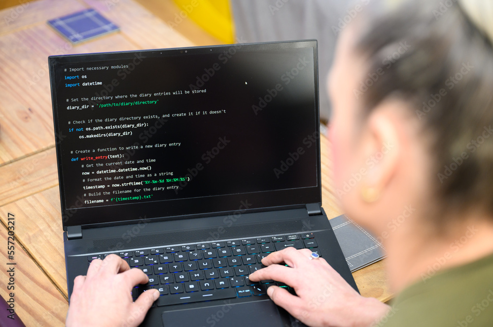 Wall mural coding in the house, a woman writing code on a laptop for an app or website while working from home