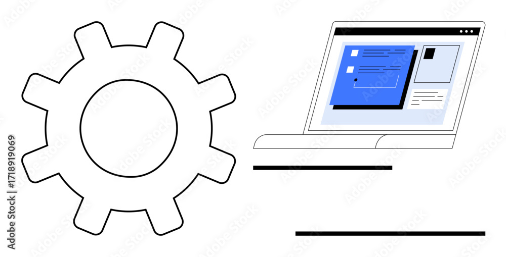 Cogwheel and laptop screen with interface elements symbolize system integration, tech optimization, Wall mural