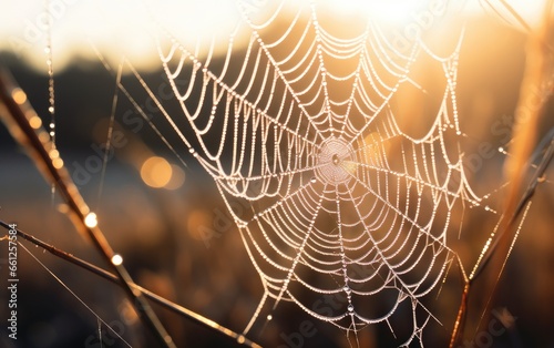 The watermark will not be included on Wall mural.: Cold dew condensing on a spider web with morning light rays in the background