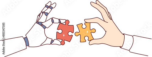The watermark will not be included on Wall mural.: Collaboration between robot and human performing same task and holding different pieces of puzzle in