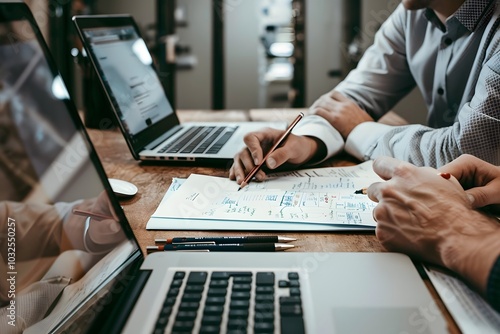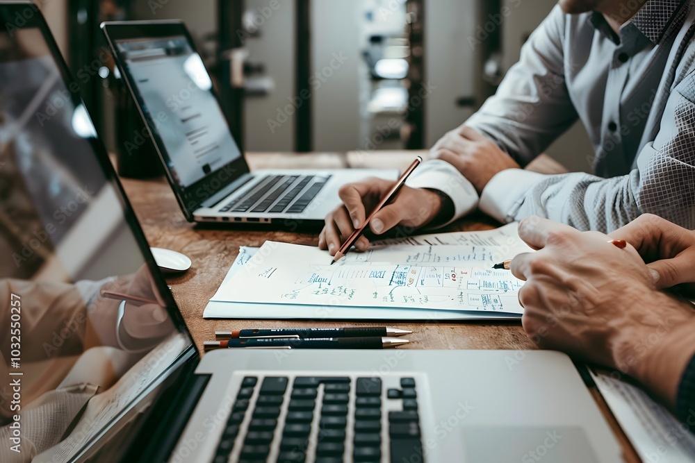 The watermark will not be included on Wall mural.: Collaborative work session with laptops and sketches