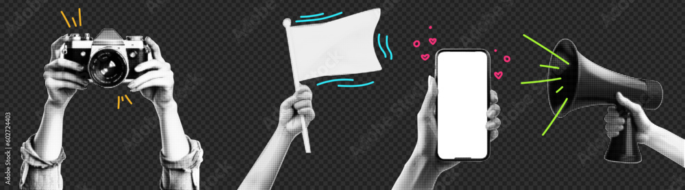 The watermark will not be included on Wall mural.: Collage element with hands and cutout shape and doodle element - vintage vector set - retro halftone e