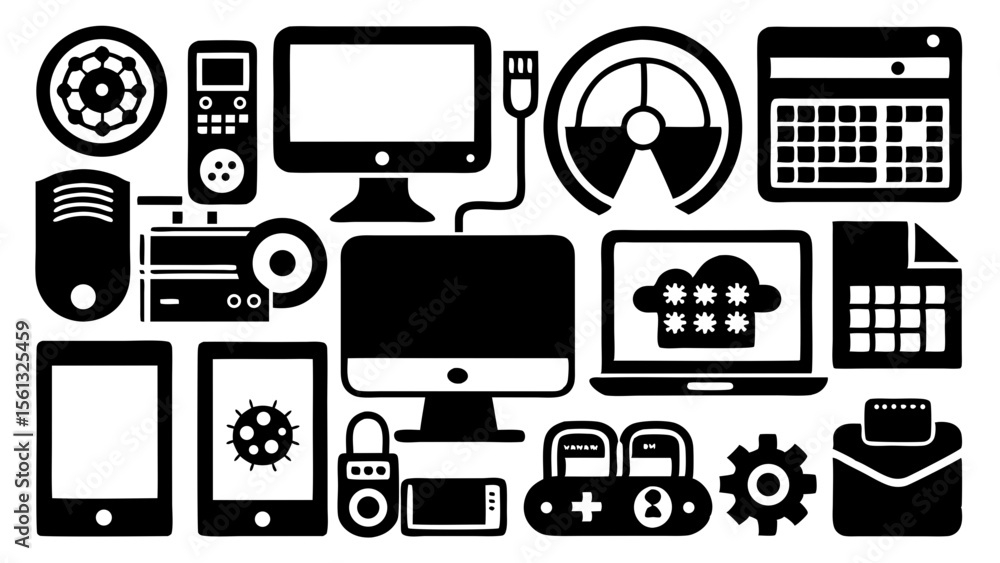 Wall mural collection of black and white technology and computer icons representing digital security and data p - Wall murals Wall mural collection of black and white technology and computer icons representing digital security and data p - Wall murals