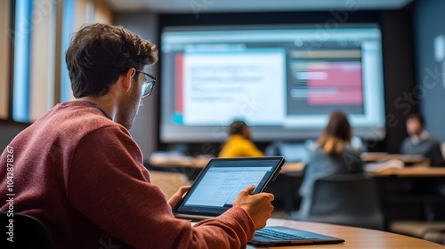 The watermark will not be included on Wall mural.: College student using hybrid learning methods in classroom environment