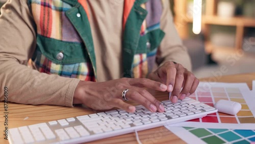 Wall mural color swatch, hands and keyboard with graphic designer at desk in office for feedback or planning. a