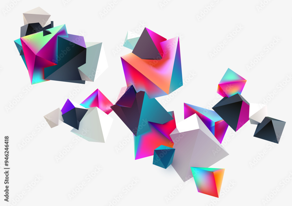 The watermark will not be included on Wall mural.: Colored 3d pyramids - abstract background of flying iridescent geometric shapes -