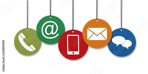 Wall mural : Colored website and internet contact us page concept with hanging icons in front of a white backgrou