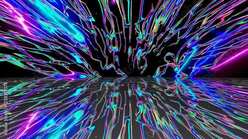 Wall mural : Colorful abstract light patterns burst across a reflective surface in a vibrant display of motion an