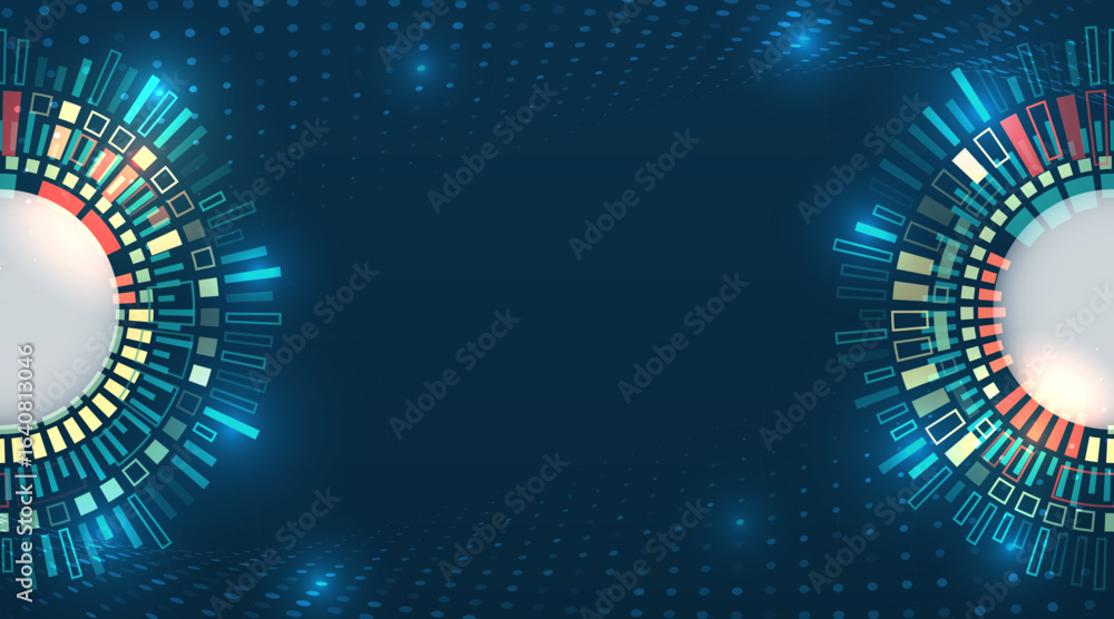 Wall mural : Colorful abstract tech background with a central circular interface and dynamic dotted wave patterns