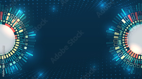 Wall mural colorful abstract tech background with a central circular interface and dynamic dotted wave patterns