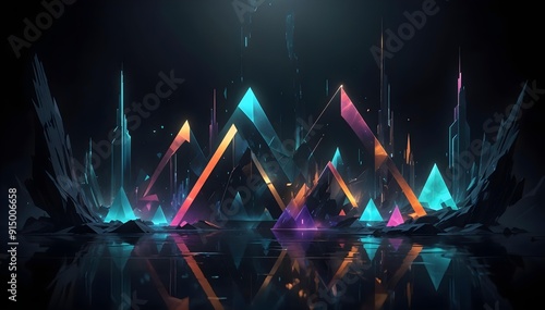 The watermark will not be included on Wall mural.: Colorful abstract triangular shapes with glowing neon lights, creating a futuristic and vibrant back