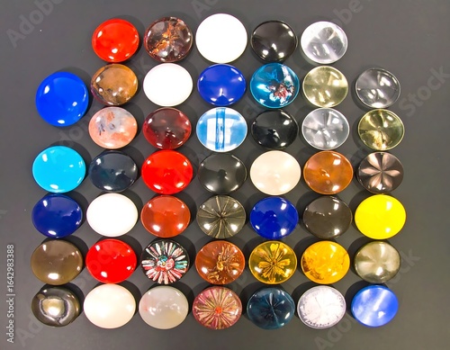 The watermark will not be included on Wall mural.: Colorful assortment of round buttons arranged in a grid on a dark surface