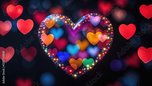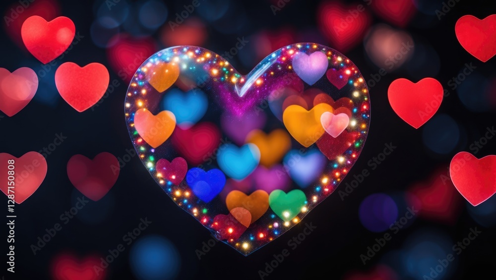 Wall mural : Colorful bokeh heart shapes with blurred lights on a dark background creating a romantic atmosphere