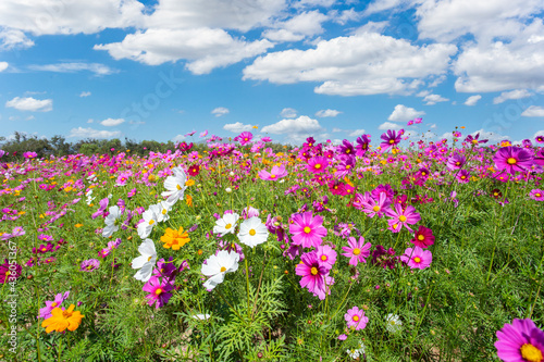 Wall mural colorful cosmos blooming in the beautiful garden flowers on hill landscape mountain and summer.