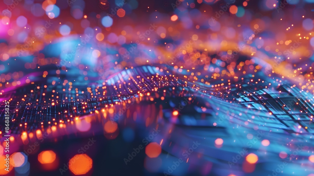 Wall mural colorful digital network with orange and blue lights background for technology and data visualizatio