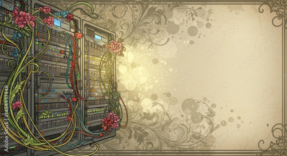 The watermark will not be included on Wall mural.: Colorful floral elements intertwine with a complex array of technological devices, creating a juxtap