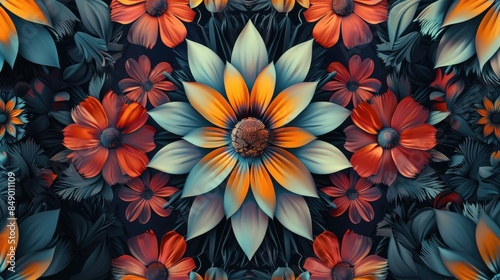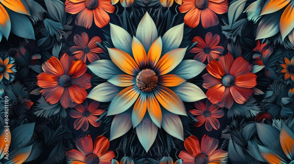 The watermark will not be included on Wall mural.: Colorful flowers in abstract symmetric patterns displaying ornamental kaleidoscope movement with geo