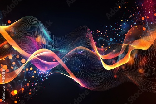Wall mural colorful flowing waves with glowing bokeh and particles on a dark background generative ai