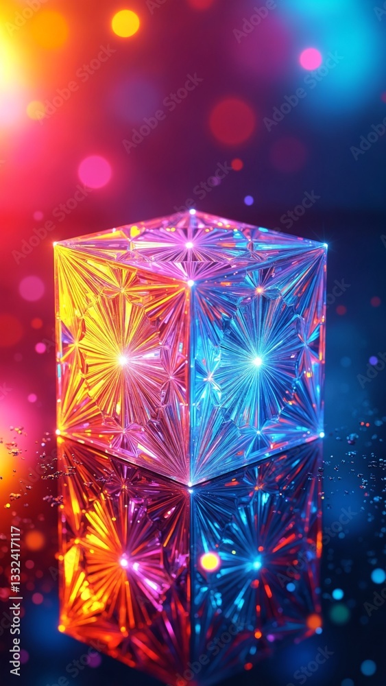 The watermark will not be included on Wall mural.: Colorful geometric cube with intricate patterns and reflections on a vibrant background showcasing l