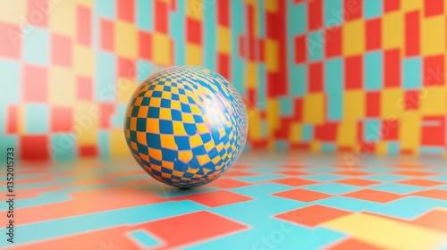 Wall mural : Colorful geometric patterned ball displayed within a checkered room setting