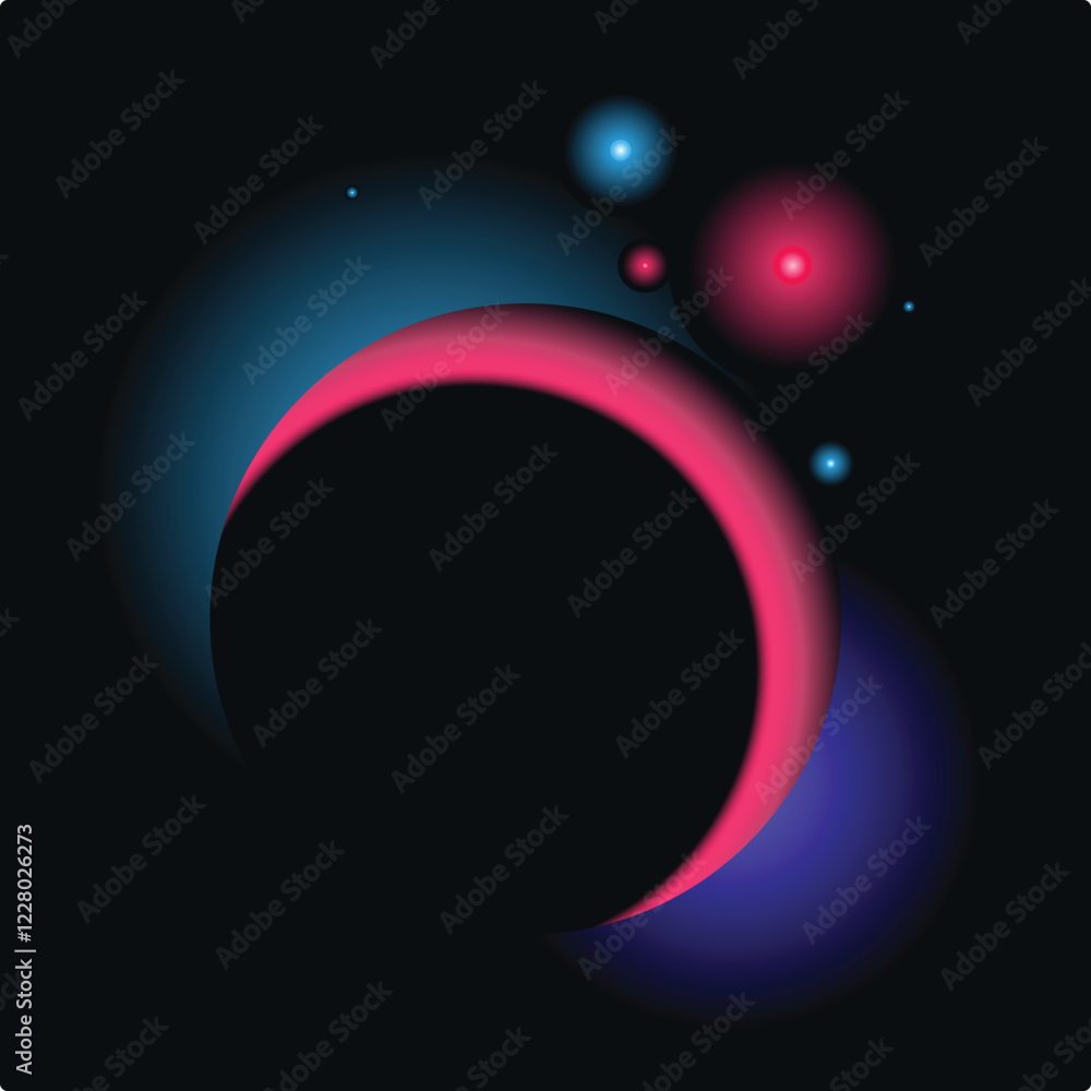 Wall mural : Colorful gradient spheres orbiting a large planet with a dark surface in the vastness of space