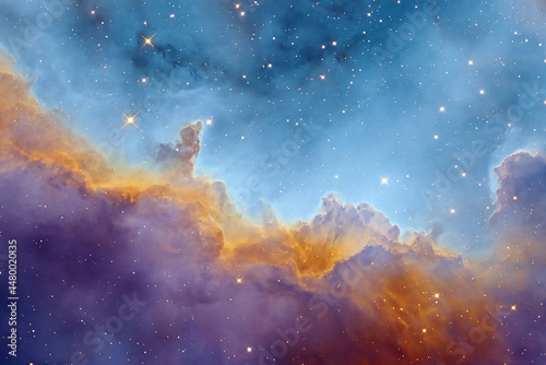 Wall mural : Colorful nebula view showcasing vibrant gases and stars against a deep blue and orange background in