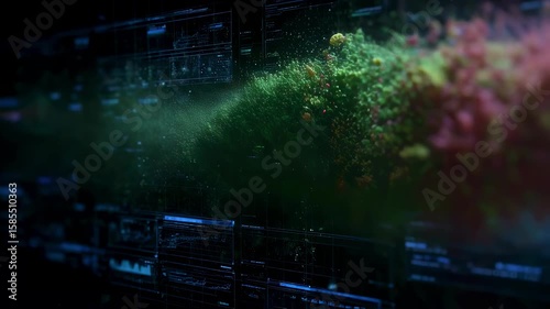 Wall mural colorful particles exploding and dispersing in front of digital screens showing data analysis, creat