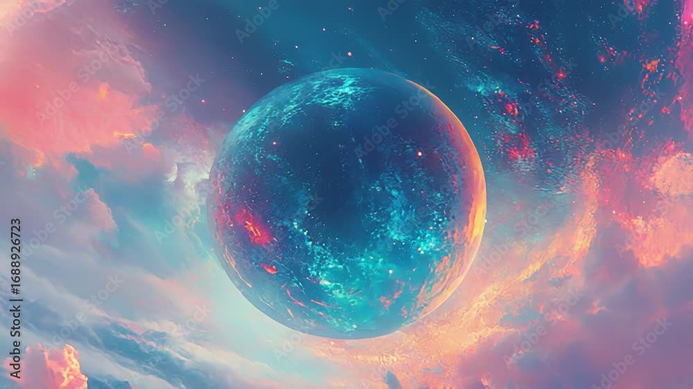 The watermark will not be included on Wall mural.: Colorful planet floating in space with pink and blue nebula clouds
