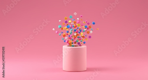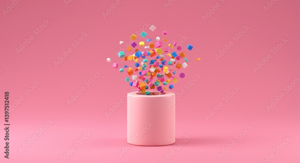 The watermark will not be included on Wall mural.: Colorful shapes exploding from pink cylinder - abstract of vibrant multicolored shapes erupting from