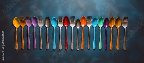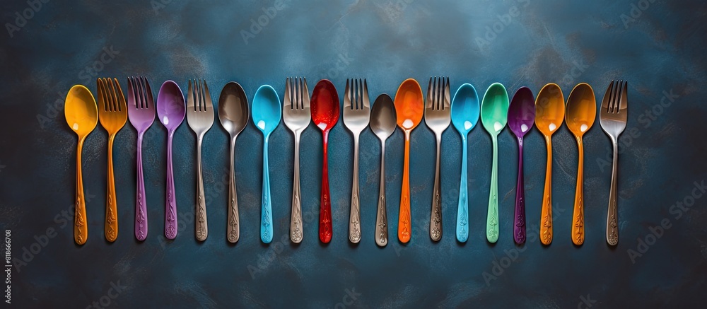 Wall mural colorful spoon and fork element arranged on a table from a top down perspective creating an appealin
