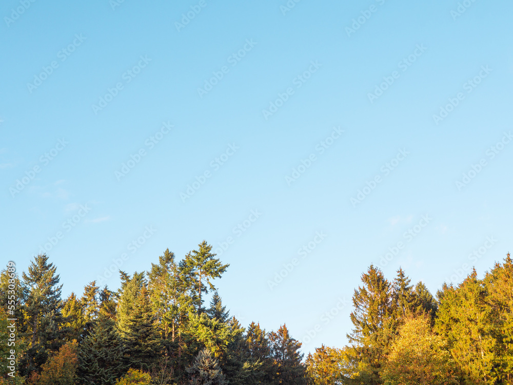The watermark will not be included on Wall mural.: Colorful trees in autumn and a clear blue sky for background and with copy space