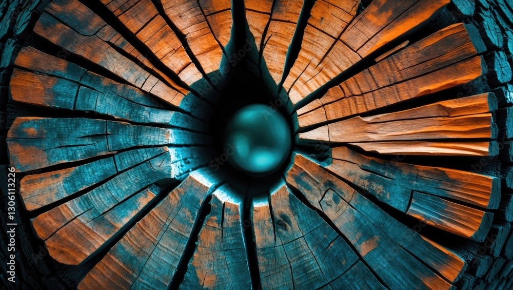 The watermark will not be included on Wall mural.: Colorful wooden texture of a cut tree trunk with intricate patterns and a central sphere reflecting