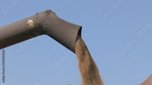 The watermark will not be included on Wall mural.: Combine harvester unloads wheat grain into the tractor trailer - combine grain unloading in a close -