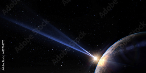 Wall mural comet, asteroid, meteorite flying to the planet earth on the background of night sky. asteroid and t - Wall murals Wall mural comet, asteroid, meteorite flying to the planet earth on the background of night sky. asteroid and t - Wall murals