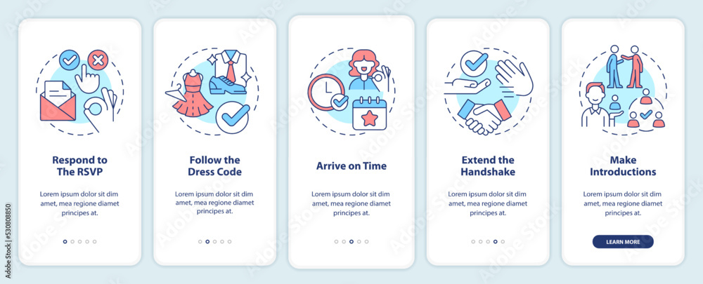 Common business event etiquette rules onboarding mobile app screen - walkthrough 5 steps editable graWall mural