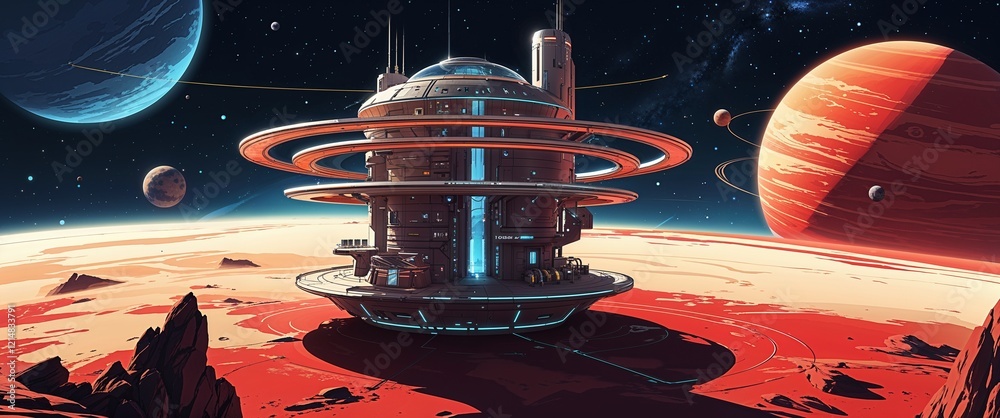 Compact futuristic station with multilayer rings red rocky planet with visible terrain faroff galaxyWall mural