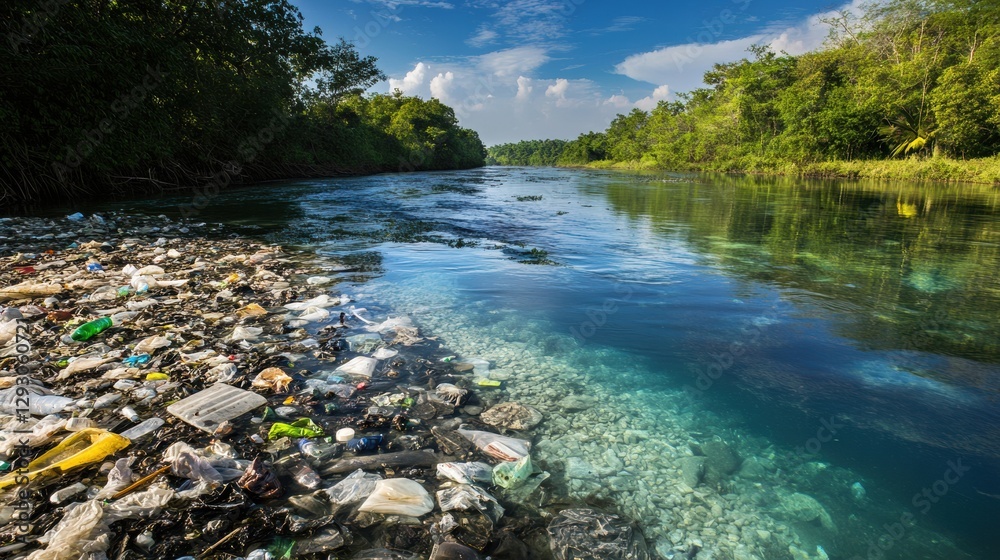Wall mural : Comparison of a polluted river filled with trash and a pristine stream showcasing environmental cont