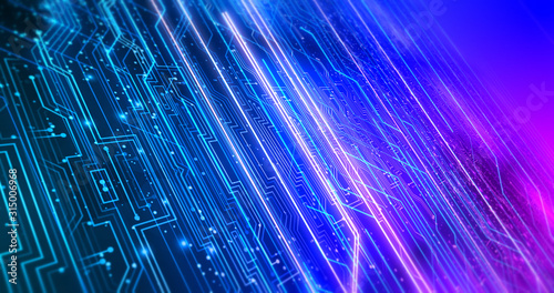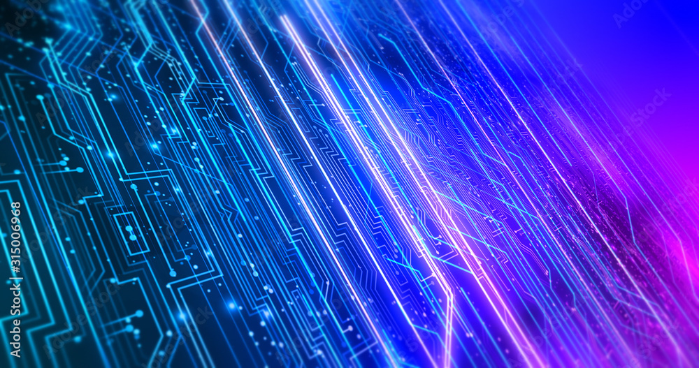 Wall mural complex computer server circuit board in digital space illustration render - technology related abst