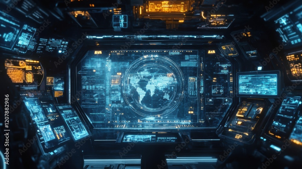 The watermark will not be included on Wall mural.: Complex control panel featuring holographic planet earth and various data streams on multiple digita