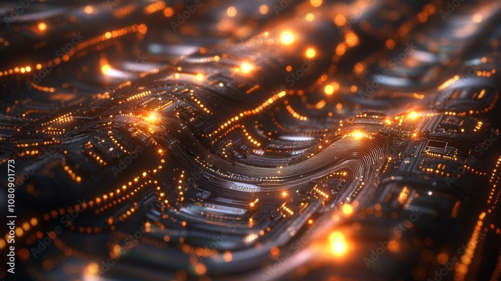 The watermark will not be included on Wall mural.: Complex electronic circuit board pulsating with orange light, representing data transfer, processing