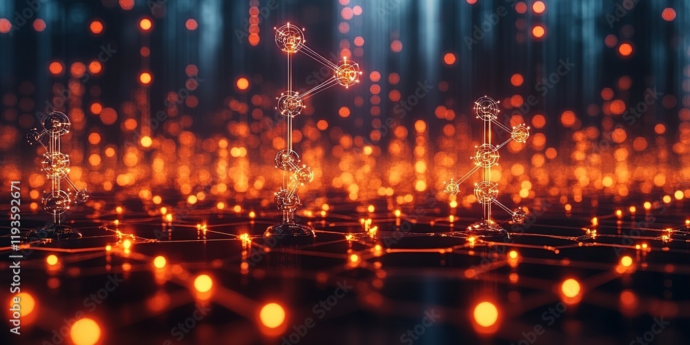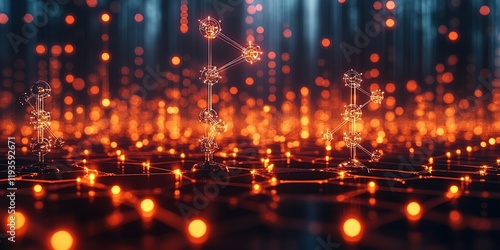 The watermark will not be included on Wall mural.: Complex network of glowing nodes and connections illuminated in a digital landscape at dusk