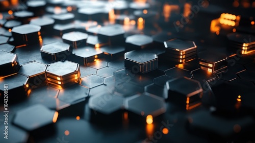 The watermark will not be included on Wall mural.: Complex web of interlocking 3d hexagons with light reflections in a high-tech design