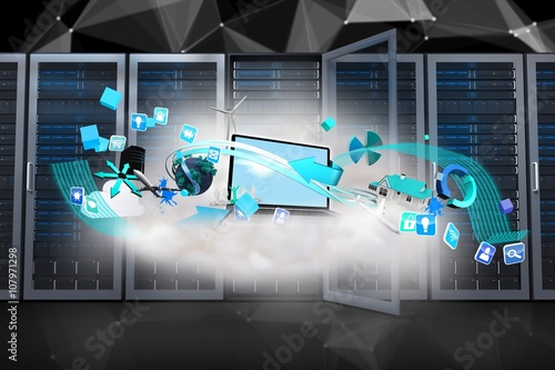 Wall mural : Composite image of laptop on floating cloud with apps