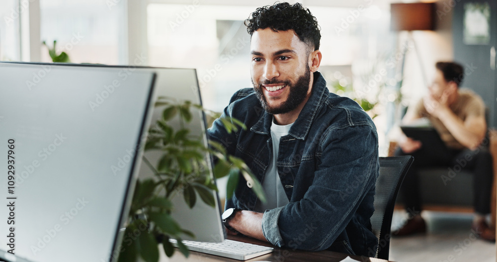 Wall mural computer, smile and web development with man in creative workplace for coding or design. cybersecuri