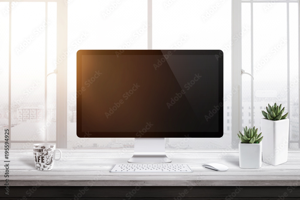 Wall mural computer display with blank screen for mockup in office or work room. window and sun light in backgr - Wall murals Wall mural computer display with blank screen for mockup in office or work room. window and sun light in backgr - Wall murals