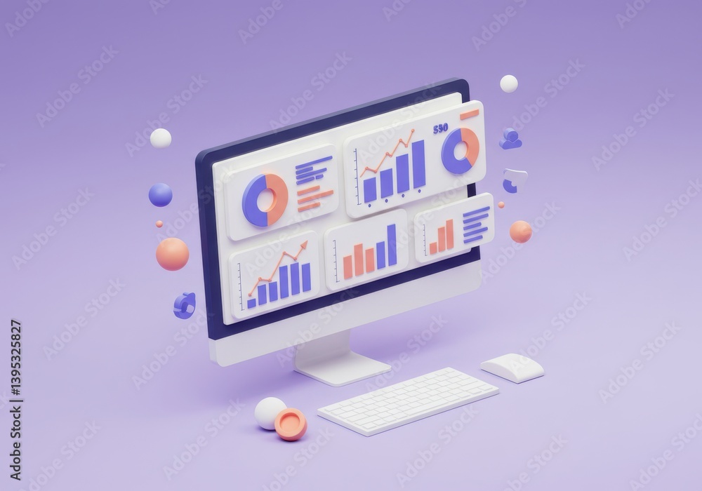 The watermark will not be included on Wall mural.: Computer display with charts and keyboard on light purple