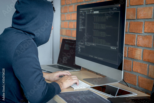 Wall mural computer hacker or cyber attack concept, dangerous hooded hacker using multiple computers typing bad