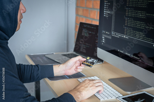 Wall mural computer hacker or cyber attack concept, dangerous hooded hacker using multiple computers typing bad